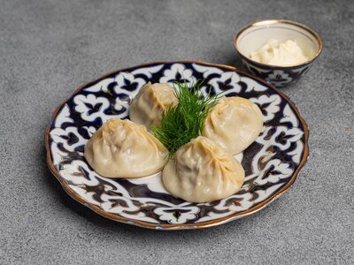Манты из тонко раскатанного теста с начинкой из рубленой телятины (4 шт.). Подаются со сметаной