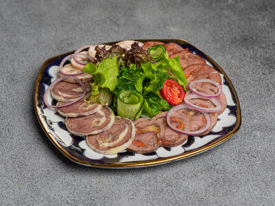Ассорти мясных деликатесов – это разнообразие вкусов в одной тарелке! В составе ассорти: казы, говяжий язык, говяжий рулет с сыром и куриный рулет. Идеально подходит в качестве холодной закуски.
